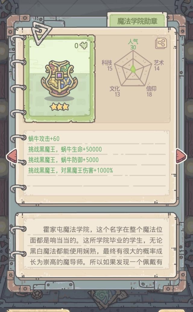 心细的小伙伴会发现,魔法学院勋章可以使得佩戴者在挑战黑魔王的时候生命 50000、防御 5000、伤害 1000%,这黑魔王是谁呢?这个答案后面揭晓。