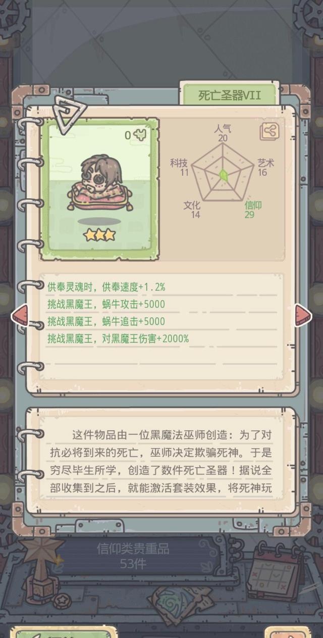 这个老魔法师被你打败一次后显然是不会善罢甘休,他回去后把哈利波特炼制成了傀儡,然后又来找我们麻烦。当你的攻击属性达到3W3左右的时候就有很大概率打败他,当你把第二次打败他的时候,会获得一个圣器。这个圣器的名字叫“死亡圣器VII”,可以加快公分速度1.2%,同样的,在打黑魔王的时候能额外加成蜗牛攻击5000、追击5000、伤害 2000%。其实这个黑魔王就是伏地魔,伏地魔前期玩家们碰不到,它需要把灵魂容器觉醒之后的幻境打败后才会解锁,灵魂容器的幻境攻击5W8、防御3W9,生命128W,所以戒戒说前期小伙伴们是不用考虑了。