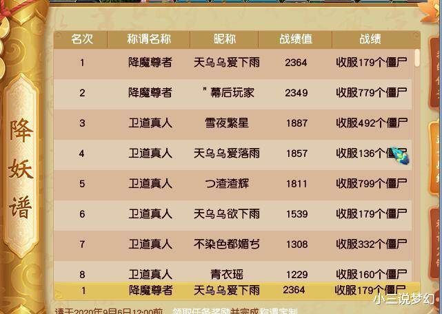 这是中元节活动僵尸大作战道士阵营的排行榜,现在的僵尸大作战其实还是组队玩比较好,因为组队之后使用技能降服对方时会增加战绩的,所以挨批明前几的大多都是五开。而且小编感觉这是策划用来创收的一种方式,这样就会有多的人创建小号进入自己的队伍,这些小号的作用仅仅只是为了给自己带来加成,原本每个小时只需要消耗六点点卡,现在每个小时就需要消耗30点点卡了。
