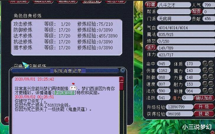 这是一位109级全敏捷加点的无底洞角色,他的三修已经满了,但是刷天下识君任务的时候还是被邀请战斗中的守卫给打死了,还因此掉了60多万的梦幻币和1级师门技能,这一次的死亡损失可大了。在天下识君的邀请战斗中仅仅只是满修是不行的,尤其是低等级的玩家还必须拥有足够高的抗性,无底洞这800多点的防御根本就没有用,护卫很少开刀都是八九百的,很有可能一个横扫千军加必杀就会将这种满修的角色带走。