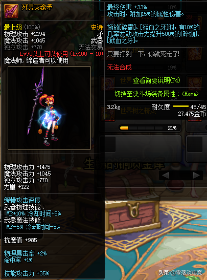 简单来讲,这个角色即便不去追求武器特效,输出也能达到7000E,如果在配合赌狗三件套+赌狗矛,1.2万亿也能上去,不过那就是图一乐,实战上指望不上。如果诸位想找点有乐子的职业玩玩,那斗萝是个不错的选择,三觉后的输出更是浮夸。