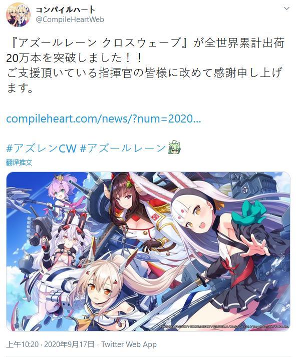 今日(9月17日),Compile Heart官方宣布《碧蓝航线Crosswave》(中文名为《碧蓝航线交汇的航迹》)全球累计出货量已经突破20万份,官方表示感谢。
