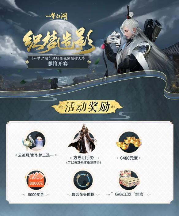 另外,官方为了鼓励少侠们使用梦境编辑器制作视频,还推出了编辑器视频创作大赛!获奖者,还有机会获得丰厚现金、云追月大奖等等奖励!还有方思明老公的手办哟~可千万别错过此次机会,我们赛场上见!