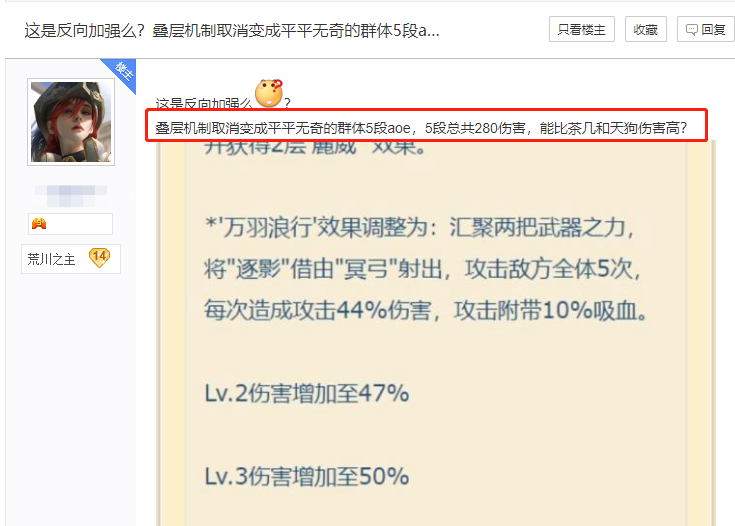 根据一些体服大佬的测试加强之后的铃鹿御前其强度差不多能跟泷夜叉姬和大天狗持平,再也不是以前的仓管了,但是面对这样一个“加强”许多玩家却并不领情,认为这个匆匆上马改动的技能非但没有加强铃鹿御前反而直接破坏了铃鹿御前的特色。