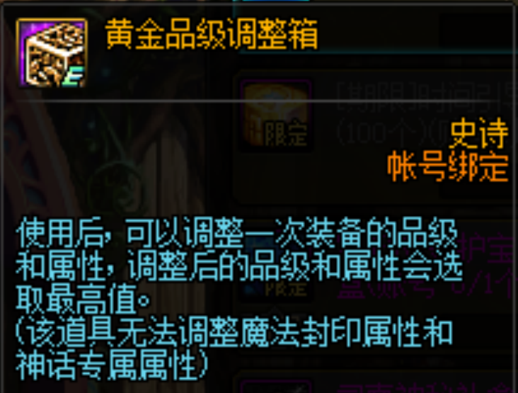 在100级版本要说玩家最想要又最难获得的是什么?除了自己想要的神话装备之外,就是把神话属性调满了,神话拥有3~4个属性词条,调满属性非常困难,有些玩家甚至花费500以上的调整箱都没有调满,而且还非常浪费时间,如果有神话品级调整箱的存在就能很好解决这个问题。