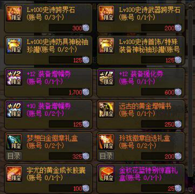 在此次的金秋礼包中,亮点道具有很多,1~80技能+1光环,1~50技能+1鞋子宝珠,每购买一套获得增幅支援套装自选礼盒等等,除了礼盒中的黄金增幅书之外,就没有其他回血的道具,之前可以交易的称号也变成了账绑,如果可以的话金秋商店如,远古黄金增幅书,+10增幅卷,12强化卷,白金徽章礼盒,特别惊喜礼盒可以设定为可交易道具,加大回血力度。