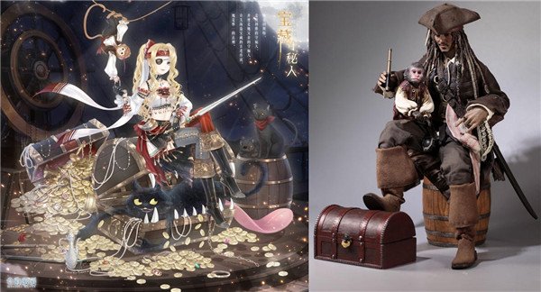 这一套明显就是借鉴了知名电影《加勒比海盗》。除了海盗主题的设定外,套装中还有不少细节证明了我们的猜想。加勒比海盗里那只调皮捣蛋的猴子在暖暖的套装里也可以找到。整体虽说不是完全相似,但是还是可以看出原型的影子。可以说是很巧妙的还原了女版海盗的样子了。