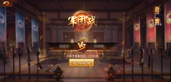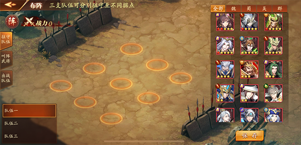 ①匹配结束后,进入驻守阶段,军团成员可以根据自身搭配编组3支防守队伍、1支进攻队伍和1名叫阵武将