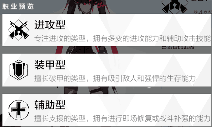 首先,游戏内是有三种职业的,即:进攻型,装甲型和辅助型。