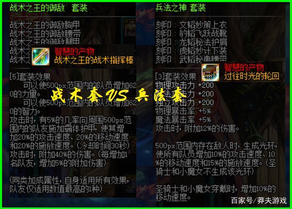 不管选择哪一套装备,由于等级限制,所以都需要用到“智慧的产物”,理想状态下,战术套升级后会比兵法套提升更大,主要多了属强和技能的提升,所以有条件选择的话,优先推荐80级战术套。