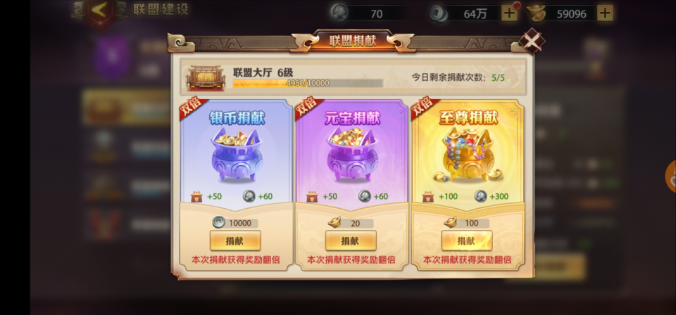 捐献资源分为银币捐献、元宝捐献与至尊捐献三种,至尊捐献获得的联盟币最多,银币捐献获得的联盟币最少,每日有5次的捐献次数限制,若是想获得更多的联盟币,可以考虑每日多进行些至尊捐献。