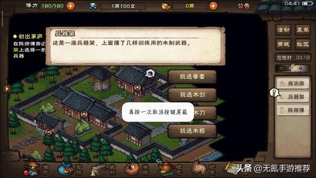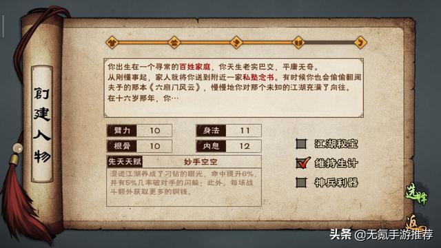 游戏中重要的还有装备,可以增加角色属性;技艺增加主角属性和可以学的武功;天赋不同的天赋加成不同的属性例如加钱加速度等;阵法可以提供buff;物资各种材料药草;记事任务和成就获得阅历。