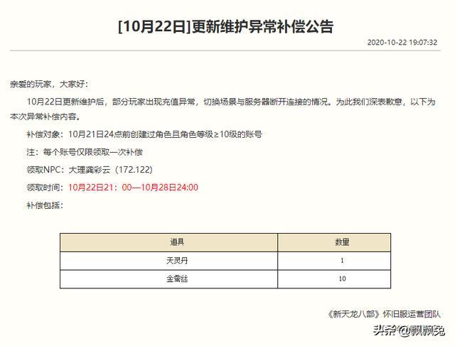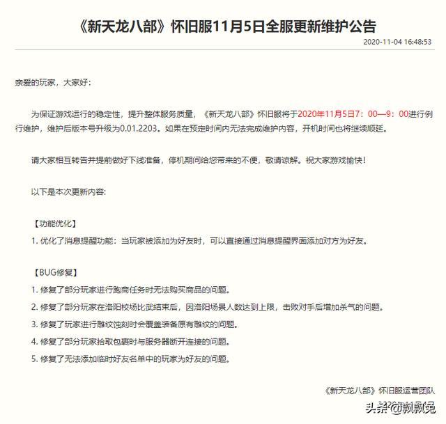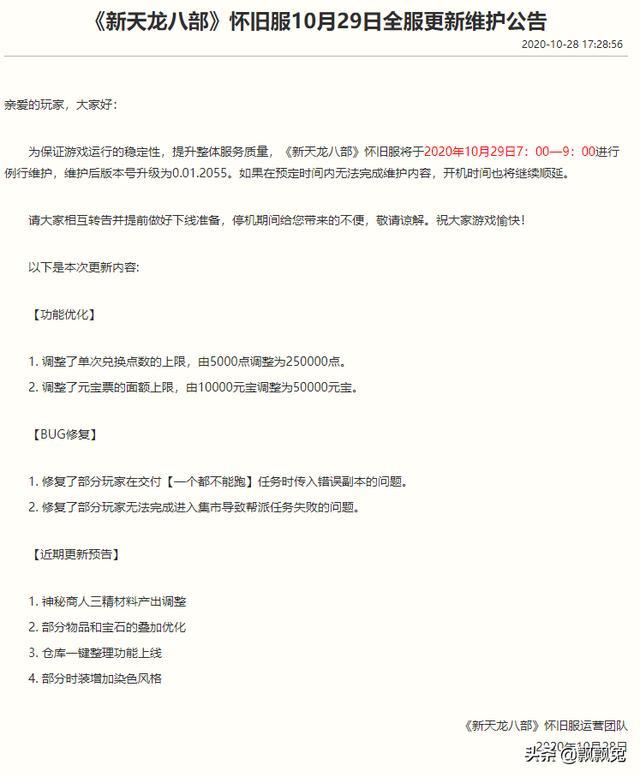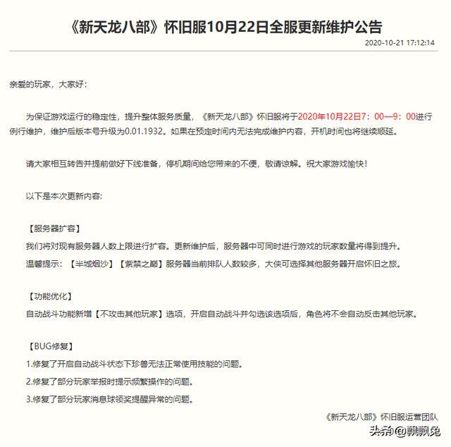 天龙八部怀旧服第一次维护2020年10月22日星期四