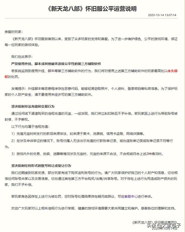 官方《新天龙八部》怀旧服公平运营说明