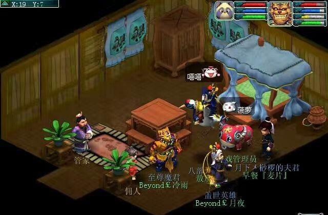 一个普普通通的民房,但是却非常温馨,小小的房间聚集着几个小伙伴一起聊聊天,或许这才是梦幻西游的真正打开方式吧,不过这个中间的游戏管理员是什么情况,而且还是一个超级神牛的造型,这个小编确实是有点不了解,有没有老玩家知道是什么情况的?