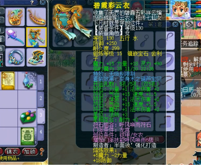 第五件,130级无级别衣服,15锻舍利子。这件衣服附加的力量,虽然没能增加自己的气血。但是对于法伤的增幅,力量是优于体质的。而且,本身这件衣服的防御很高,也就算了扯平了。