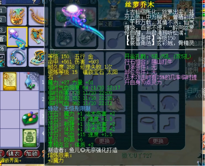 最后,150级无级别魔棒,15锻太阳石。法系武器的伤害,会按一定比例转换为自己的法伤。虽然这把武器在同等级中,伤害是国标。可对于109级的玩家来说,依然非常极品。而且附加的属性的总数值,很高。