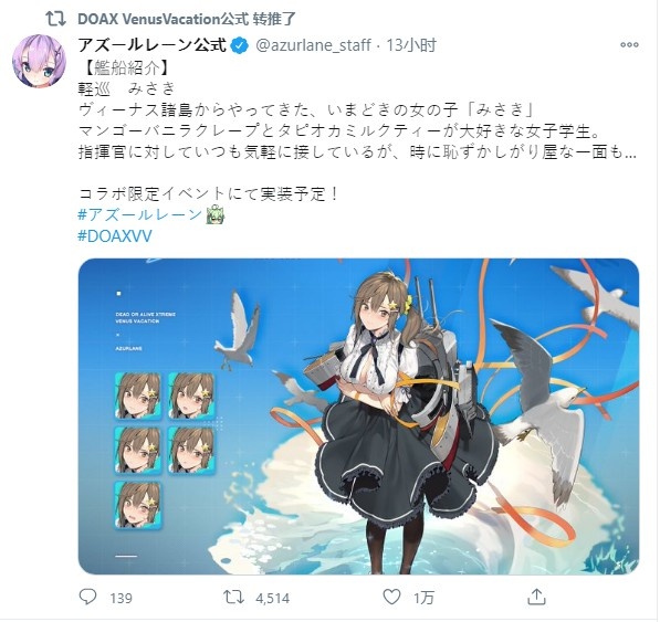 率先公告出的联动角色海咲是一位轻巡舰娘。作为沙排中的重要角色,碧蓝航线也非常完整的保留了她在原游戏中的造型。在官方的介绍中,舰娘海咲是通过联动活动来获取的舰娘,因此对于玩家们来说几乎是人手可得的一位角色。