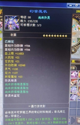 当然最近一段时间,出9星装备的玩家还是比较多的,这个幸运的玩家表示自古绑定出极品,这件9星的血衣加成还是比较满意的,但是相比极品的9星血量还是有一些缺陷,比如极品的9星血衣,血上限一般是+13000以上了,而且还有体力加成,这件衣服的灵气、定力、外功防御加成对于现版本的玩家来说,一点作用都没有。