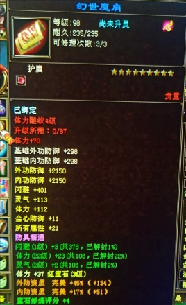 这是一个生活玩家做出来的9星护肩,闪避、体力、会防、所有属性均是有加成的,其中闪避+401,灵气+113,体力+112,会心防御+11,所有属性+21,这件装备光是体力属性加成就高达133,这一件护肩非常适合峨眉和武当,不过忽略灵气加成,基本上每一个门派都比较适合的。作为一个生活玩家,本来是不想充钱的,玩家表示最后咬牙打了一颗3级石头,真的是太心酸了。不过看热闹的网友则表示,看到镶嵌的石头,舒适感极强。