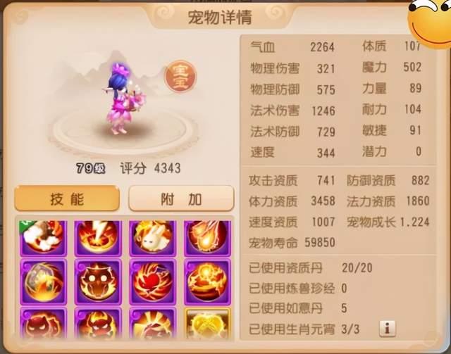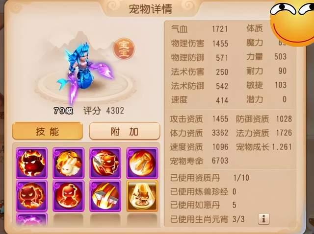 这一只是认证10技能的蚌仙子,法力资质2379,防御资质1399,体力资质4247,三项资质都非常不错,成长1.214也没有拖后腿。在技能搭配方面,除了法宠常见增强输出能力的技能外,还有高级招架、高级反震、高级强壮、高级神佑复生来增强生存能力,在战斗中既能打又能抗,再配合低级迟钝技能进一步减少速度,在战斗中后期召唤出场可谓是敌方的噩梦。