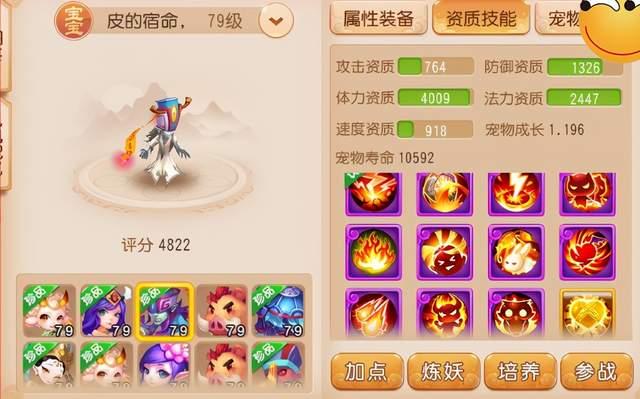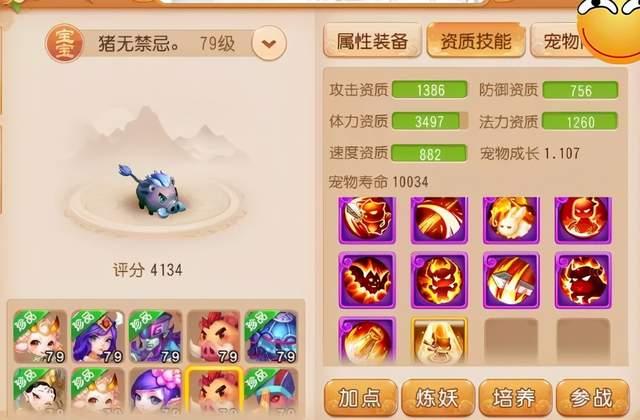 最后我们再来瞧一只9技能全红的野猪!这只野猪攻击资质1386直接满了,防御资质756,体力资质3497也都不错,唯一的缺点是1.107的成长值有点低,不过野猪毕竟是0级参战的宠物,倒也不能要求太高。在技能配置方面,这只野猪走的是隐攻流,在众多增强输出的技能与专属内丹的加持下,爆发力绝对能够震撼全场!