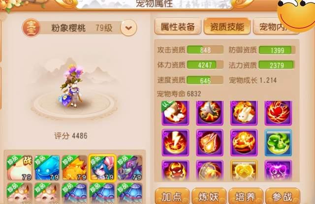 首先我们就来欣赏一只认证11技能的极品花妖,可以看到这只花妖的法力资质1860,防御资质882,体力资质3458都和属性上限差的不多,而1.224的成长更是在主流水平之上了,在搭配了专属内丹以后法术伤害属性面板已经达到了1246点。而在技能配置方面,这只花妖更是豪华,除了法宠常见的技能外,还搭配了高级会心与高级协力技能来提升输出,配合高级驱鬼和高级感知技能的效果之后,在挑战难度玩法与擂台PK时表现非常亮眼。
