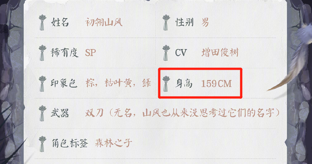 初翎山风马上就要在正式服出道了,在出道之前官方也推出了的初翎山风的档案,最让玩家们关心的是,初翎山风的身高居然只有159。如果这是别的式神,倒也没什么了,毕竟这个SP式神的形态是少年山风,属于正太体型,还可以接受,但是由于SSR阶的山风一直被玩家们调侃身高,看到这个初翎山风的身高之后,有一种莫名的萌感。