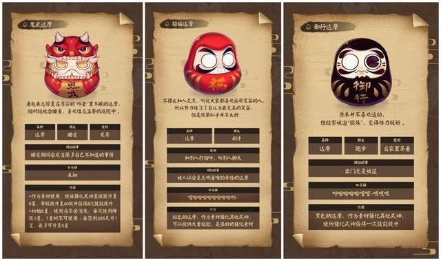 自从鬼童丸出道时推出了式神档案之后,后面所有的稀有式神出道时都会有式神档案,不过也有几个比较特殊的,各个达摩们也拥有了自己的档案,是在1500天的签到奖励公布后,其他达摩趁着鬼武达摩的东风,一起推出了档案。在式神们的档案中,让玩家们去更深入地了解一个式神,让式神的形象也更加鲜活,而且还能从中得到剧情走向。