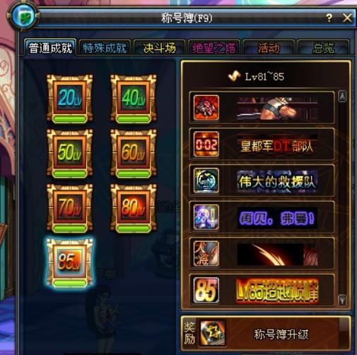 成就系统也是DNF的特色玩法之一,尤其是当初玩家们通过完成一系列成就任务,可以获得各种各样的特色称号,可是后来都被删除了。如今的DNF成就只有团本或者特殊成就,而这些称号对于玩家们的吸引力也远远不如以前那样强大。