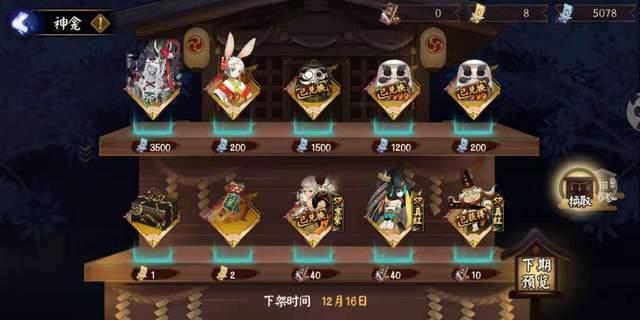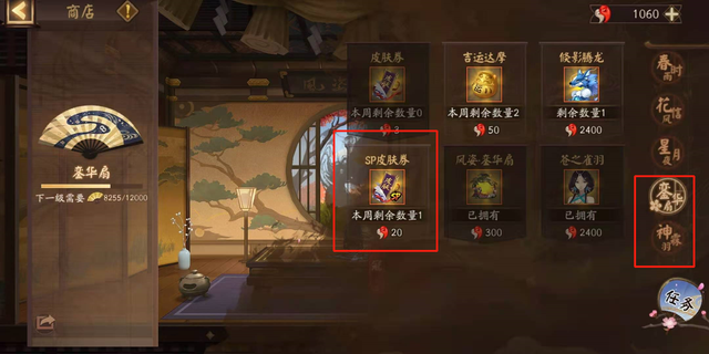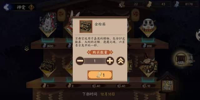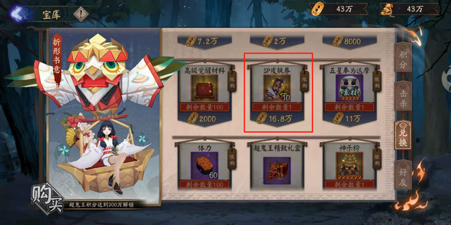 需要用到的SP皮肤券比较难获得,在这里给大家推荐几个快速获取SP皮肤券的途径。首先还是在神龛中的"金绘箱"里面进行获取,除两面佛外返魂每一个稀有式神都会得到10个金御札,1个金御札开一个金绘箱,会有概率得到SP皮肤券,为了增加获取的概率,建议大家一个一个来开箱,不要一下子开10个箱子,出皮肤券的几率比较低。