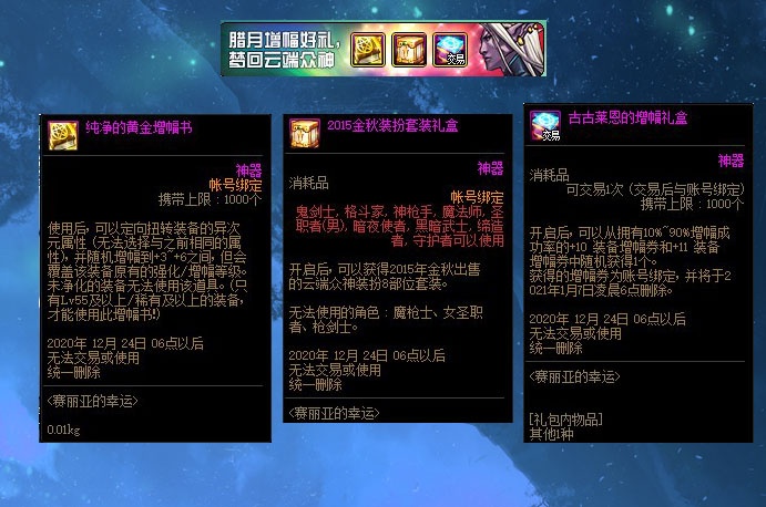 除此之外魔盒的另外两种道具黄金增幅书和古古莱恩的增幅礼盒可以说是魔盒中的常客了,尤其是今年以来策划不管是在魔盒内还是在各种活动内都不断的增加增幅道具的产出,由此可见策划要准备在装备增幅上做一些动作了。