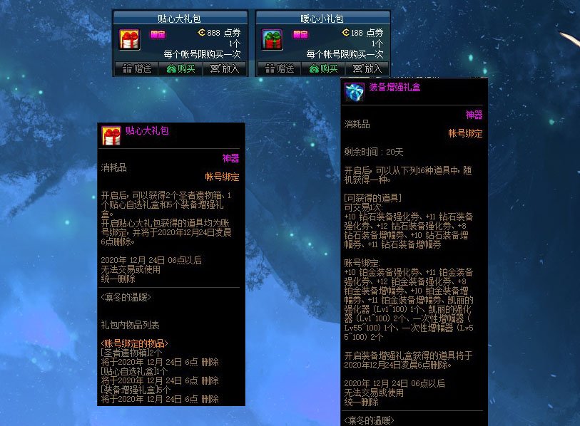 在正式服12.10更新后商城会上架两款礼包,分别是“贴心大礼包”和“暖心小礼包”分被售价为888点券以及188点券,前者大礼包打开后可获得2个圣者遗物箱、1个贴心自选礼盒以及5个装备增强礼盒,圣者遗物箱也就是不用钥匙打开的高级魔盒,但是几率要看个人而定了,按照购买一套魔盒500点券的花费来算,这款礼包还是比较划算的,并且还有5个装备增增强礼盒,运气好的话还能开到+11钻石增幅券,但是相信大家开到应该都是保底2个一次性增幅器的奖励。