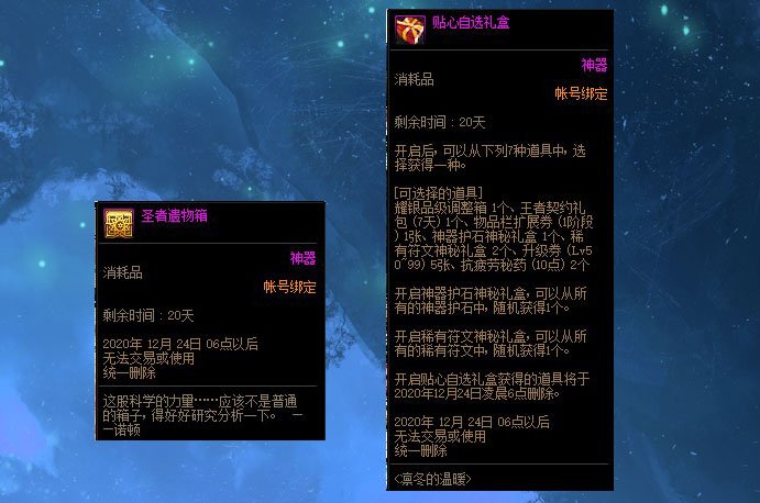而小礼包也就是大礼包的低配版,打开后则可以获得1个圣者遗物箱和3个装备增强礼盒,188点券的价格还是比较划算的,并且还有三个装备增强礼盒可以搏一搏运气还是比较不错的,但对于非酋玩家来说暖心礼盒很有可能变为寒心礼盒。
