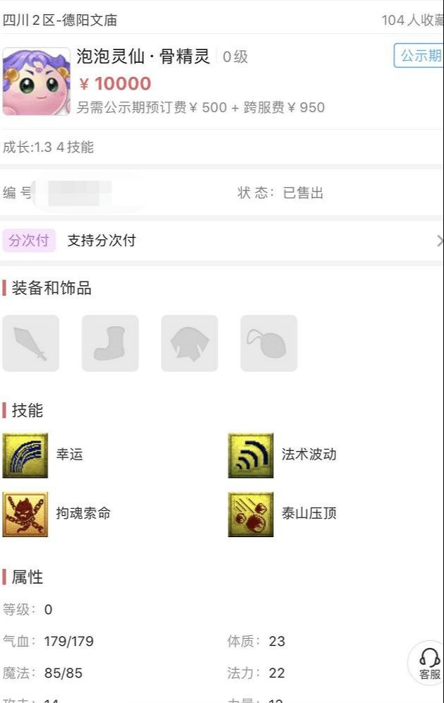这只泡泡灵仙的卖家很是幸运,在带小号扫塔时意外获得了一颗泡泡祈福石,随手一洗结果迎来了泡泡灵仙-骨精灵!运气简直好到爆炸!第一只成功在藏宝阁上交易的是剑侠客,那位玩家已经圆梦,成功打造出了1只7技能全红的泡泡灵仙。他是花费8888块买的,这位玩家却花了1万块。洗出这只泡泡灵仙的号主,也没有想到找了个包车的4开,为了节约车费自己带队,挂机了2个小时却赚了13亿游戏币,让他对大雁塔的好感倍增!简直幸运。