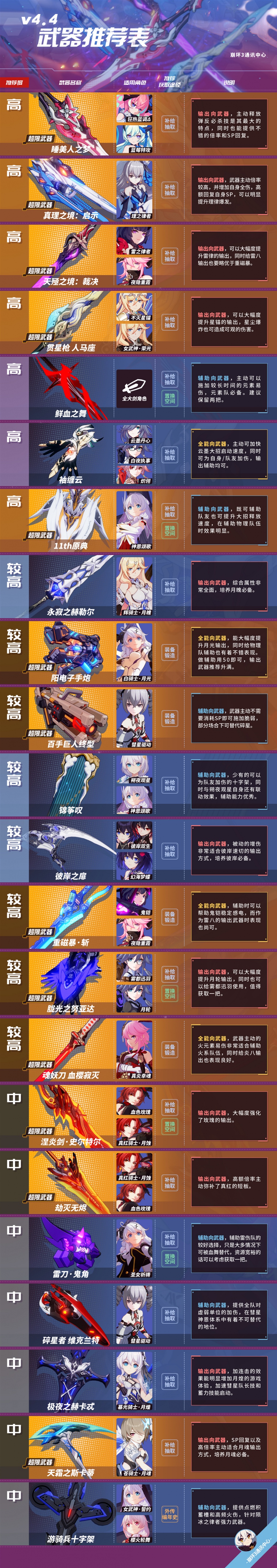 不灭星锚的专属武器,超限后对星锚而言提升明显,武器的星尘爆炸也是角色伤害的重要组成部分。目前星锚的深渊表现优秀,战场也有所发挥,且使用该角色的场合无其他优质替代武器,因此给到“高”推荐度。