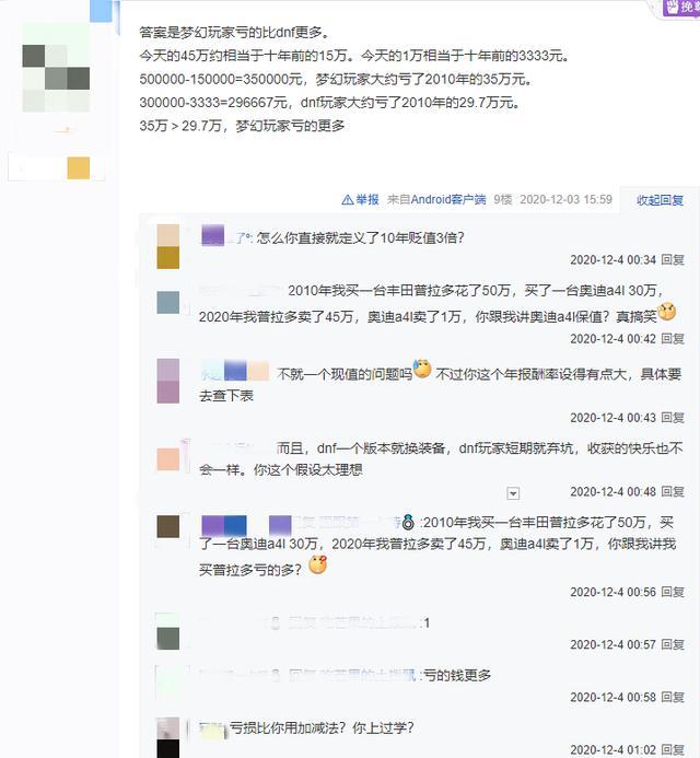 看到这道题的第一眼,叫兽的答案已经脱口欲出了,这个问题还用问吗?梦幻玩家亏了5万,DNF玩家亏了29万,肯定是DNF玩家亏的多啊。然而人人都会算的账还拿出来提问,答案肯定不会这么简单。果然在该贴的第九楼,这位玩家给出了他的答案: