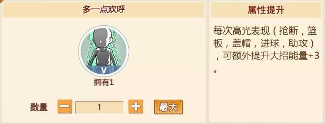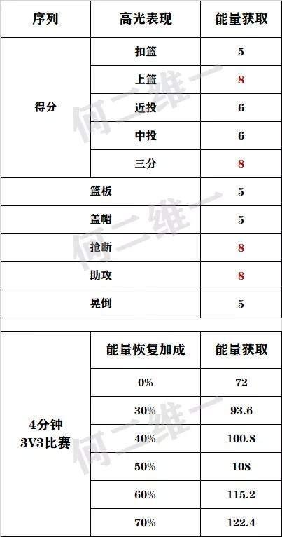 不同高光表现的能量获取值是不同的,例如在没有任何能量属性加成的前提下,一个篮板球可增加约5点能量,而一个抢断则可增加约8点能量