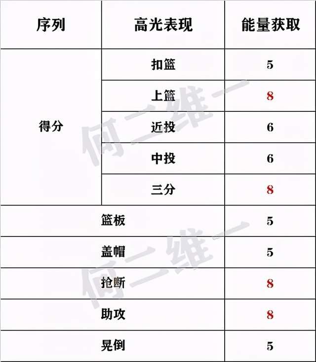 即使同样是得分,不同得分手段之间的能量获取值也是不同的,例如在没有任何能量属性加成的前提下,一个上篮得分可增加约8点能量,而一个扣篮得分则可增加约5点能量