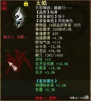 对于男魔来说,抗灵宝伤害就意味着要在装备上下功夫,虽然说对于男魔而言,抗灵宝与加速度才是最完美的装备搭配,但是要想求一件这样的装备谈何容易,单有抗灵宝伤害就已经非常不错了,就像这件帽子一样,抗灵宝伤害10的炼化属性已经算得上十分稀有了。