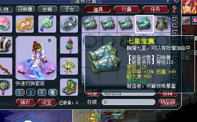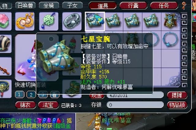 又冒出了一件须弥法宠神器,115级护腕附加法力15,灵力11,综合灵力达到了21.5,给任务法宠配带还是挺不错的。