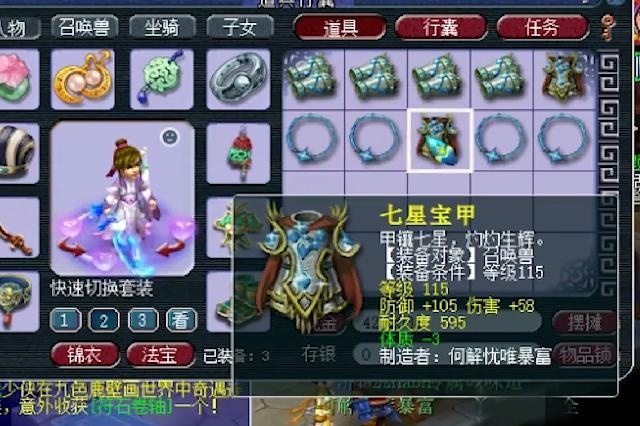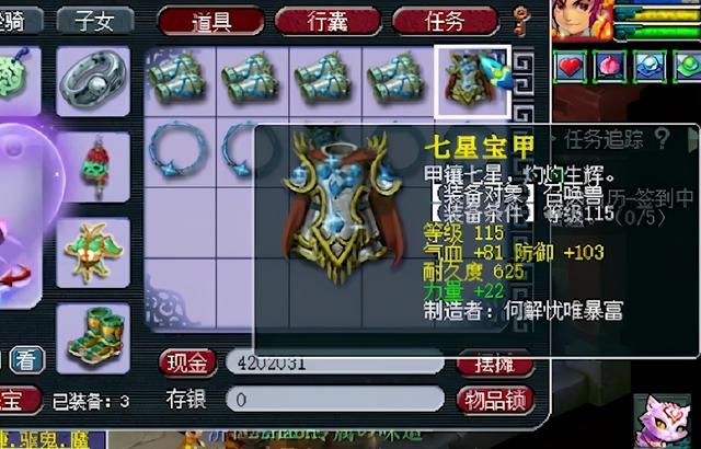 血攻宝宝神器一件,115级铠甲单加力量22,气血81,防御103,有点可惜的是没有附加伤害属性。