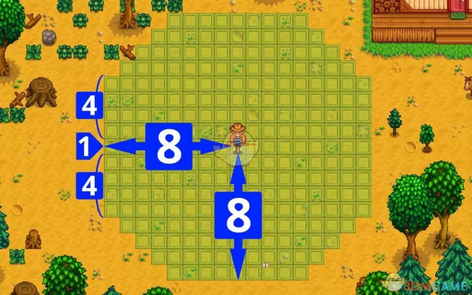 《星露谷物语》中有很多的道具,稻草人就是其中之一,稻草人的作用范围是半径8格,比如从左开始数,数8个格子,到头了就是其作用范围。而不是作用于它周围一圈的8个格子。如果有豪华稻草人的话,那么作用范围就会从8格变成16格。