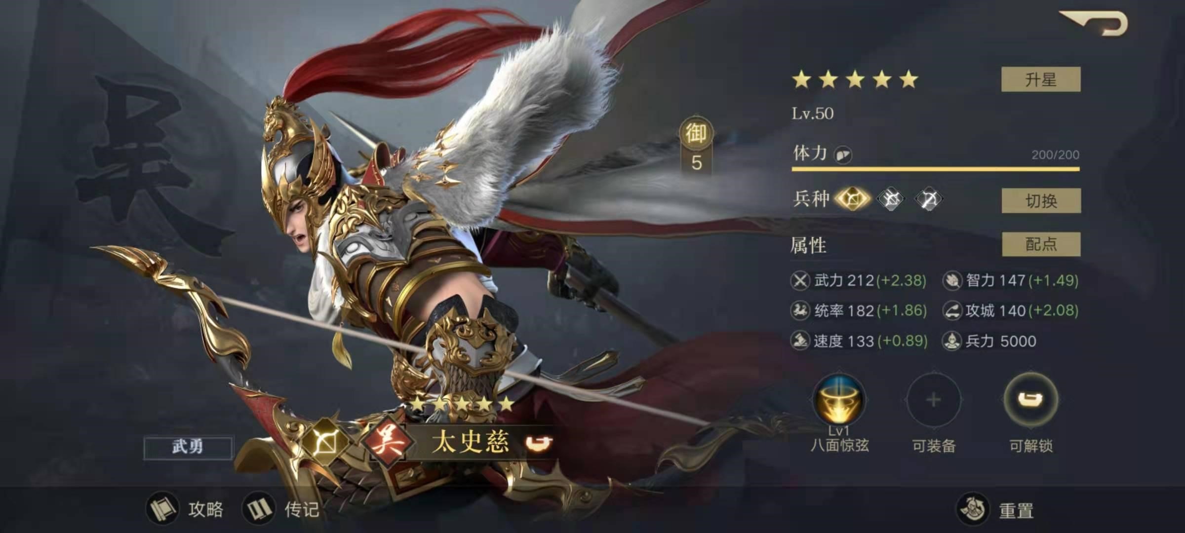 同样,吴国大将太史慈也可以通过和相应的宝物进行搭配从而发挥出最大的战力。太史慈的专属技能“八面惊弦”可以在普攻时,对周边敌军随机一支部队发动“贯腕”效果,降低统帅,并增加额外伤害。搭配宝物“诸葛连弩”,可以有几率额外增加普攻的次数,从而增加获得“贯腕”效果的敌方部队,因此来大幅度削弱敌方战斗力。
