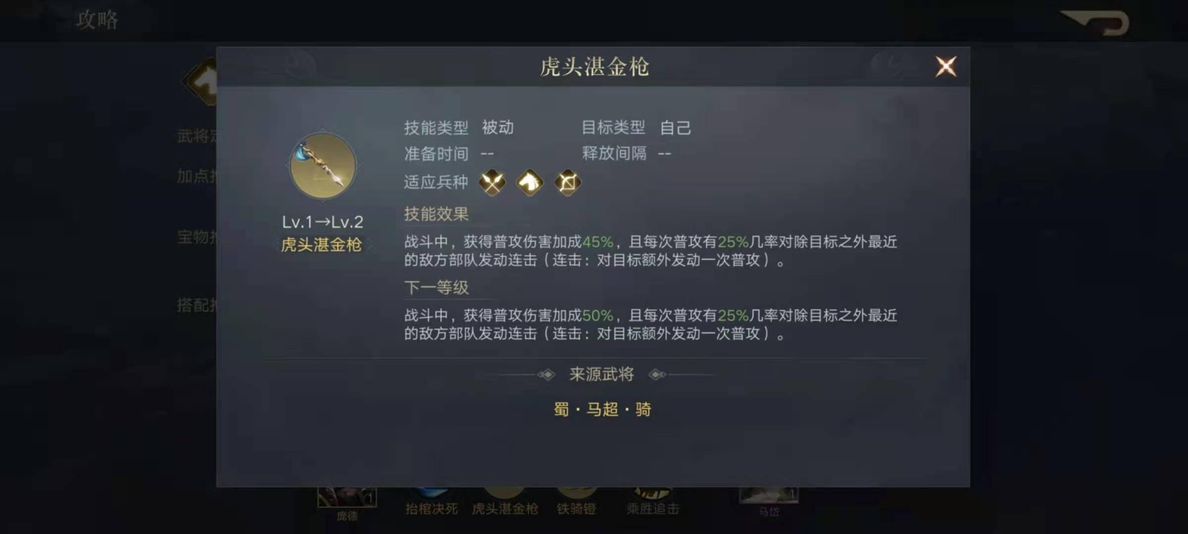 比如在游戏中,蜀国大将马超的专属技能“神威天将”就可以让自身的普攻伤害增加,并有几率造成双倍伤害。对于一个被动技能来说,如何能在整场战斗中提升普攻的攻击力,并增加多次攻击次数,触发双倍伤害就是核心的攻击思路。因此,只要玩家搭配宝物“虎头湛金枪”,就可以获得普攻伤害加成,并且有几率对目标最近的敌人发动连击,从而增加触发双倍伤害的几率。