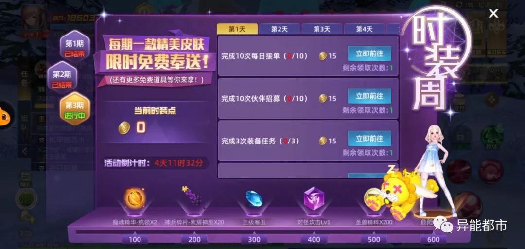 在跑主线任务以及支线副本时,还能顺带完成【时装周】里面的任务,获取限时奖励,当时装点达到600时,还可以解锁趣妙平衡车。