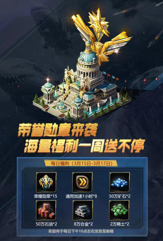 3月11日-3月17日,我们都会为指挥官们送上资源和通用加速哦, 其中3月11日-3月13日主要奖励为资源和通用加速,但是在3月14日-3月17日,我们的主要奖励除了资源和通用加速还有荣誉勋章。
