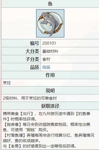 1、游历时触发【钓鱼事件】时有一定几率获得【鱼】;
