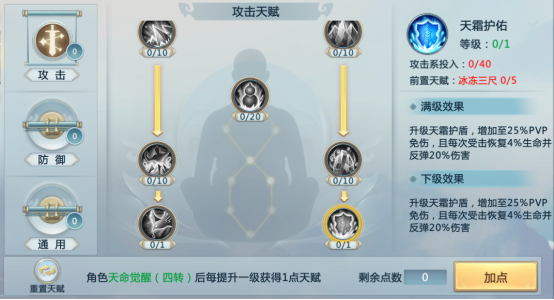 天赋分为三大类:攻击、防御、通用。每个天赋都有等级上限,不同天赋有不同的技能等级上限,天赋每提升1级,对应增加的技能效果或属性都会获得大幅提高!