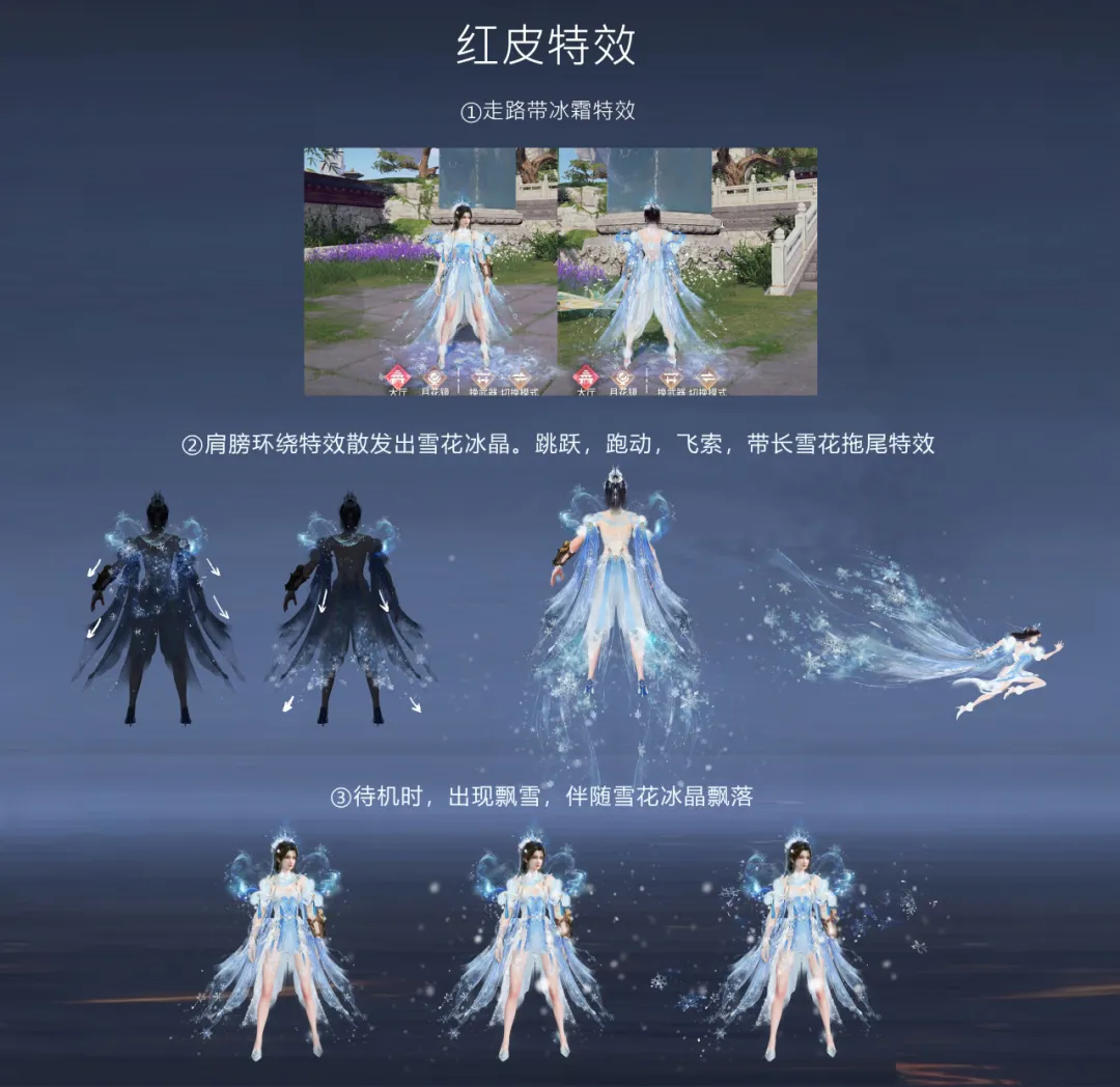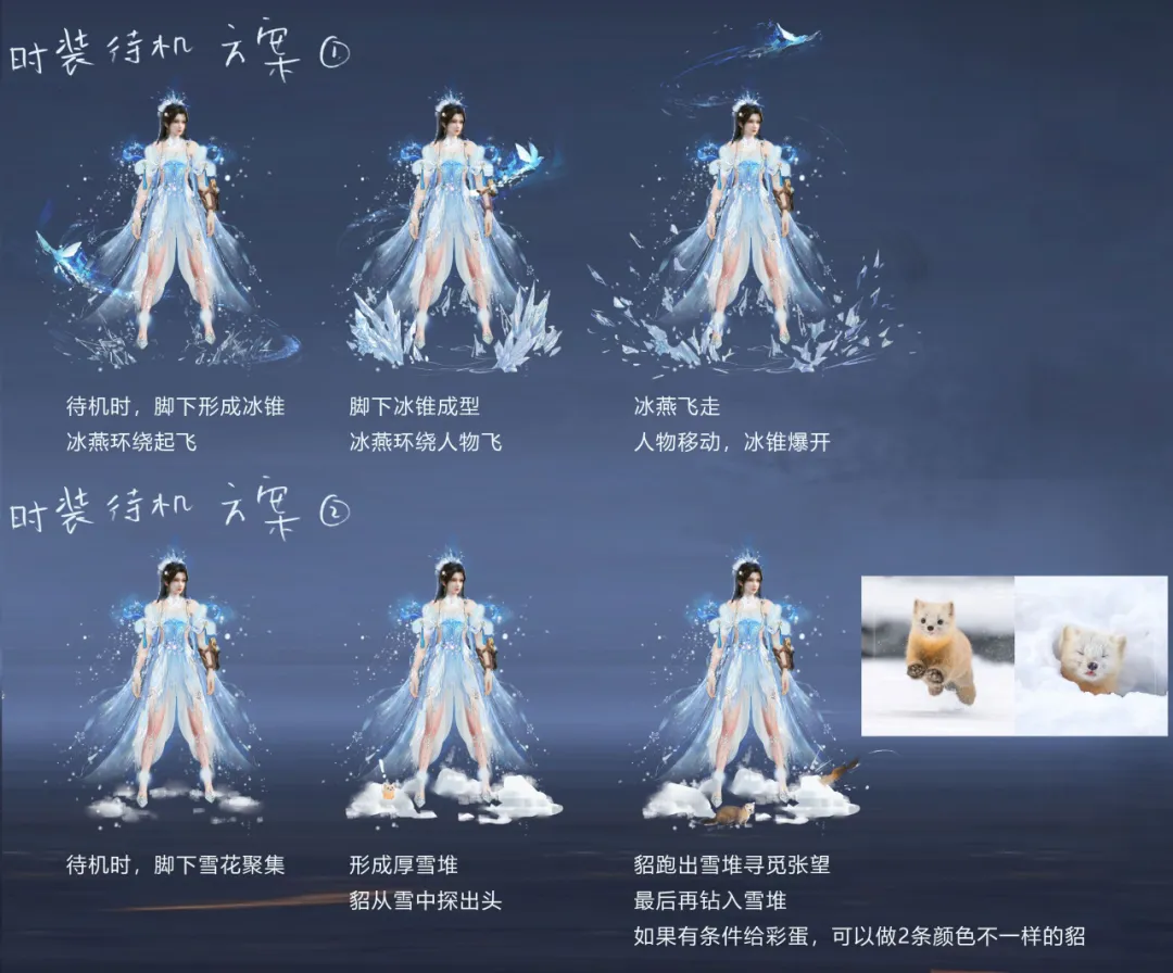 在设计待机特效时,美术大大还有一个绝妙灵感:清寒脚下会形成厚雪堆,一只可爱的小貂蹿出雪堆寻觅张望,甚至还会有不同颜色的小貂作彩蛋~